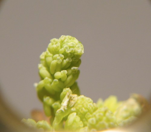 This is the tip of a knobby spur twig of a gingko branch that had been knocked down in the snow some weeks back in Prospect Park. I brought it home and popped it in some water to see if it would leaf-out. Slowly, but surely, it is. It has an undersea look to it in this photo, which I concocted with my macro lens and 10x loupe.
