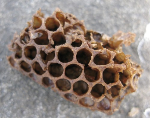 Some kind of comb. Not honey bee, it seems too small, and the shape wrong for a feral hive, but some other species of hymenoptera.
