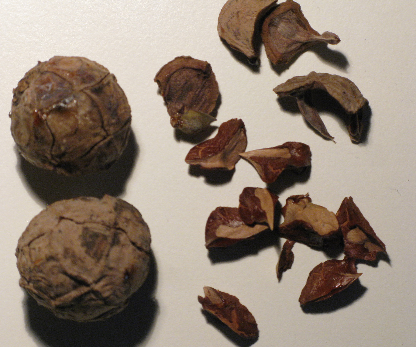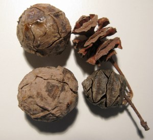 I have trouble distinguishing the baldycypress (T. distichum) and dawn redwood (M. glyptostroboides) trees, but the cones are quite different. Above, the baldycypress cones are to the left, the dawn redwood to the right. I have a house full of pods, seeds, and cones, I’ve never found very many baldycypress cones before. They break up very easily. (The two above are actually already open at the bottom.) But, with a good number of everything thrown down from above in last weekend’s strong winds, I found a mess of them recently in Green-Wood.