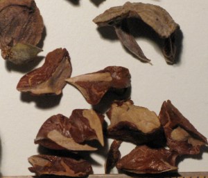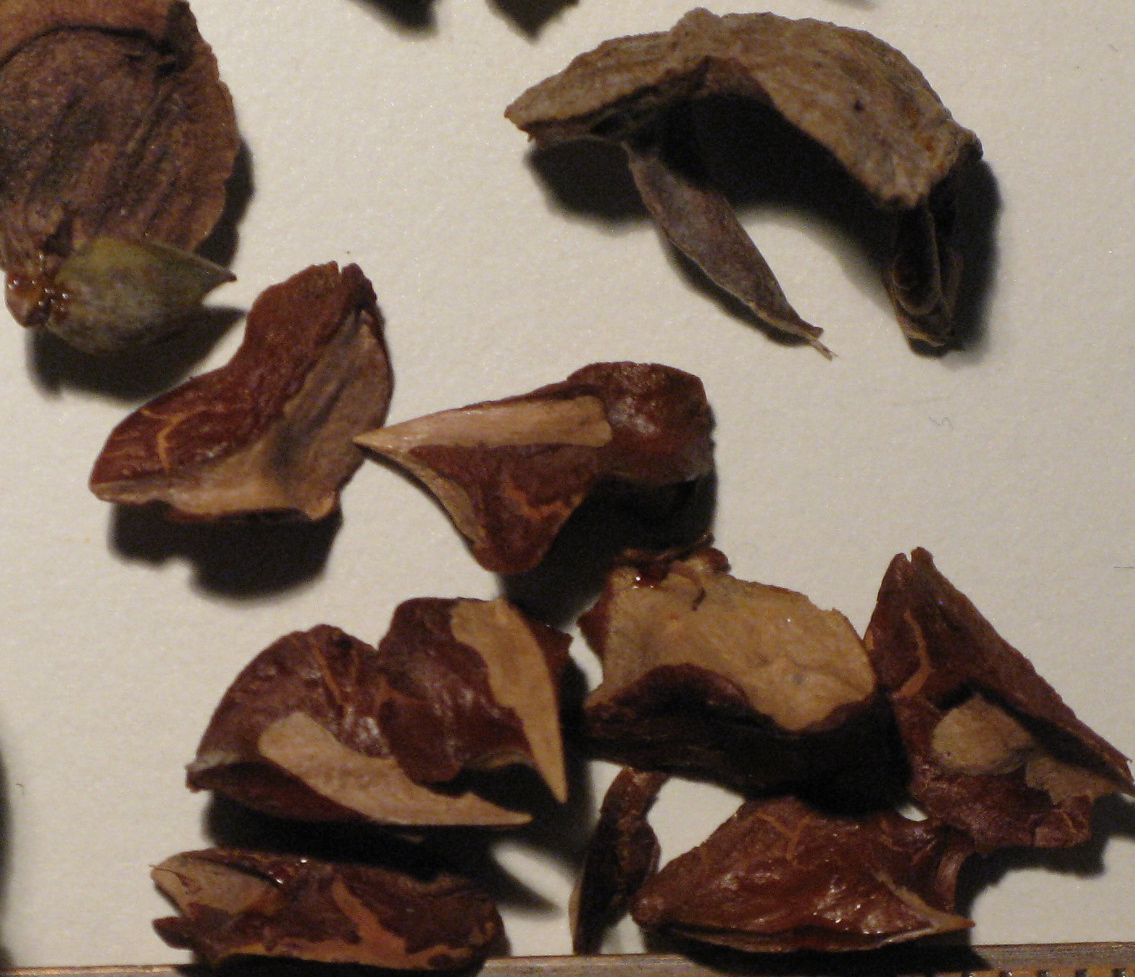 And these are the seeds in more detail. No two are alike. The cones have a reddish yellow resin inside that is very sticky and stainy (for you, readers, I go to extremes of messiness), and a nice subtle smell.