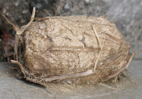 Cocoon, open…. This is somewhat similar to the one I saw last week, but attached to a lamp post instead of suspended from a twig. Also, it’s darker. This one is just as big, though, just over an inch long, half or more wide. A big fat moth? What do you think? Should I bring it home to hatch it out? (Another mouth to feed! Or not, some adult lepidoptera don’t eat.) Word of the day, btw: holometabolism, or complete metamorphism, the four-stage process undergone by butterflies and moths and some beetles, ants, bees, wasps, flies, even fleas.