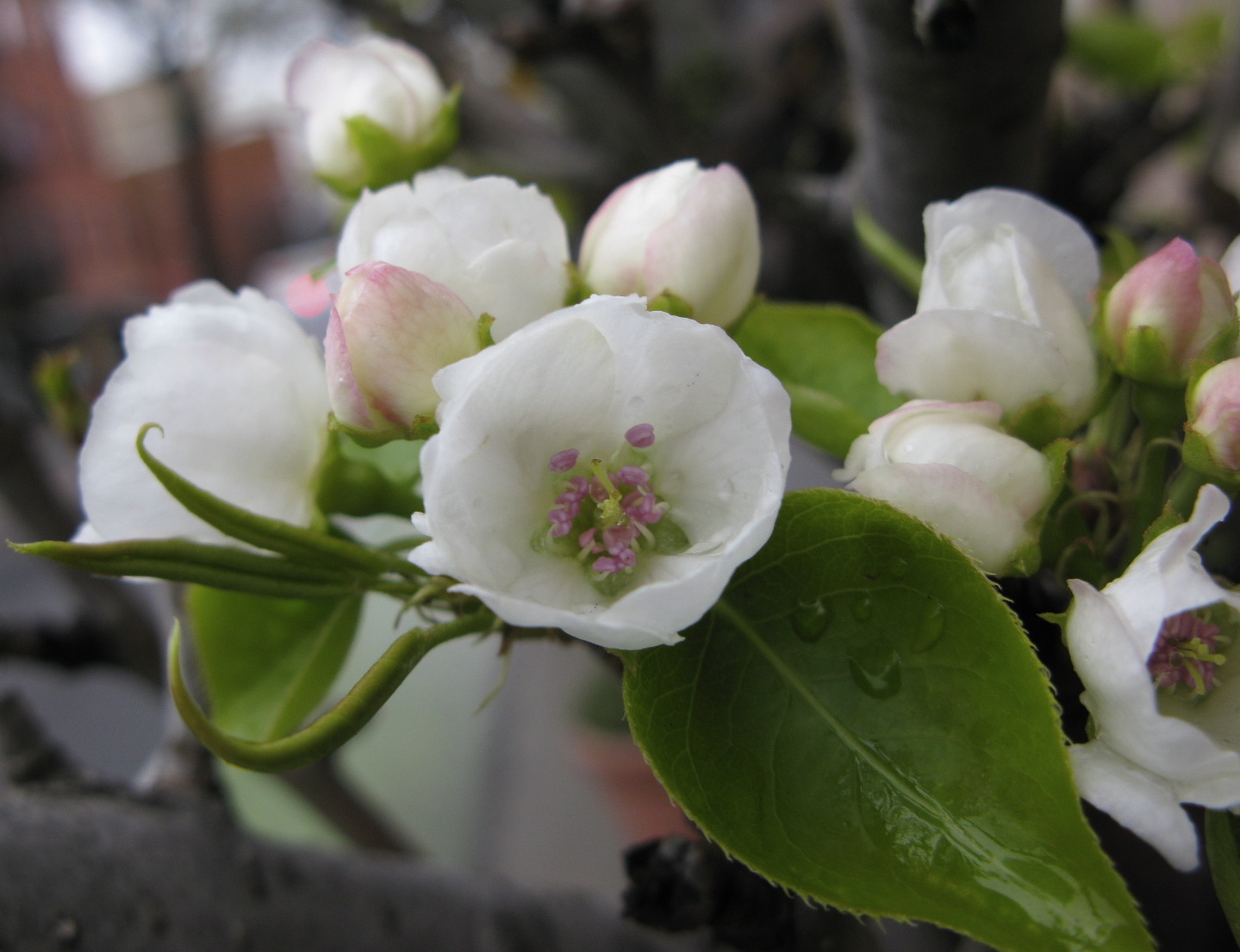 The local quince tree, a cultivar of Cydonia oblonga. This is not your average NYC street tree; it’s not even on the official street tree list. But there you go. It’s here, it’s blooming, and it usually fruits — smaller pomes than you see in the supermarket. Actually, you probably don’t see quince in the supermarket. It’s a farmer’s market item, and not very common then. The fragrance of the fruit, however, perfumes a whole room, and the hard, slightly pear-shaped, sometimes fuzzy-skinned fruits are worth seeking out just for the smell. But you can eat them too, after cooking them well. I’ve added them to apple pies and made tasty compotes/jam from them. They have lots of pectin. The fruit is generally more appreciated over the Atlantic than here.