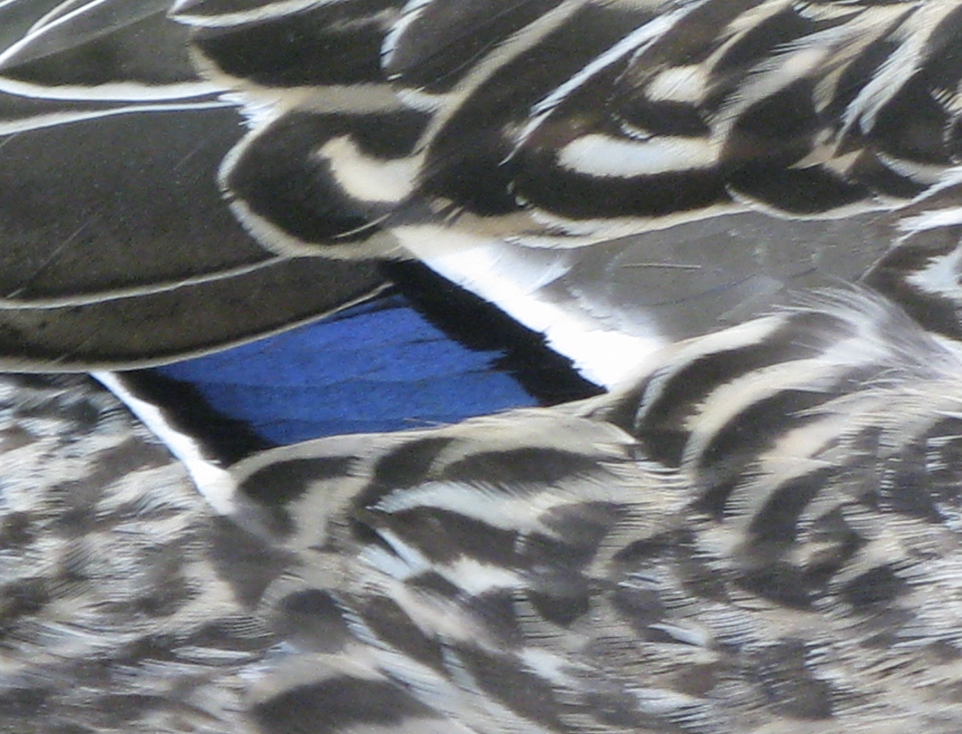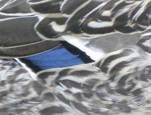 The side of a female mallard by the Upper Pool in Prospect Park. The patch of blue with white edge is called a speculum (that’s Latin for “mirror,” ladies). A number of our ducks have these, but I think this blue/white combo is unique to the mallards (of course, ducks are great hybridizers, so hybrids can sport these as well). The color is specifically on some of the secondary flight feathers, those on the back edge of the wings closest to the body.