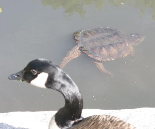 This one was about 16″ long from snout to tail tip. And note that long tail, with small spikes looking rather dinosaur-ish: none of our other turtles has such a prominent tail. Also, the toothy projections on the rear edge of the carapace (top shell) are distinctive. (The Canada goose wasn’t intimidated by me or the snapper.)