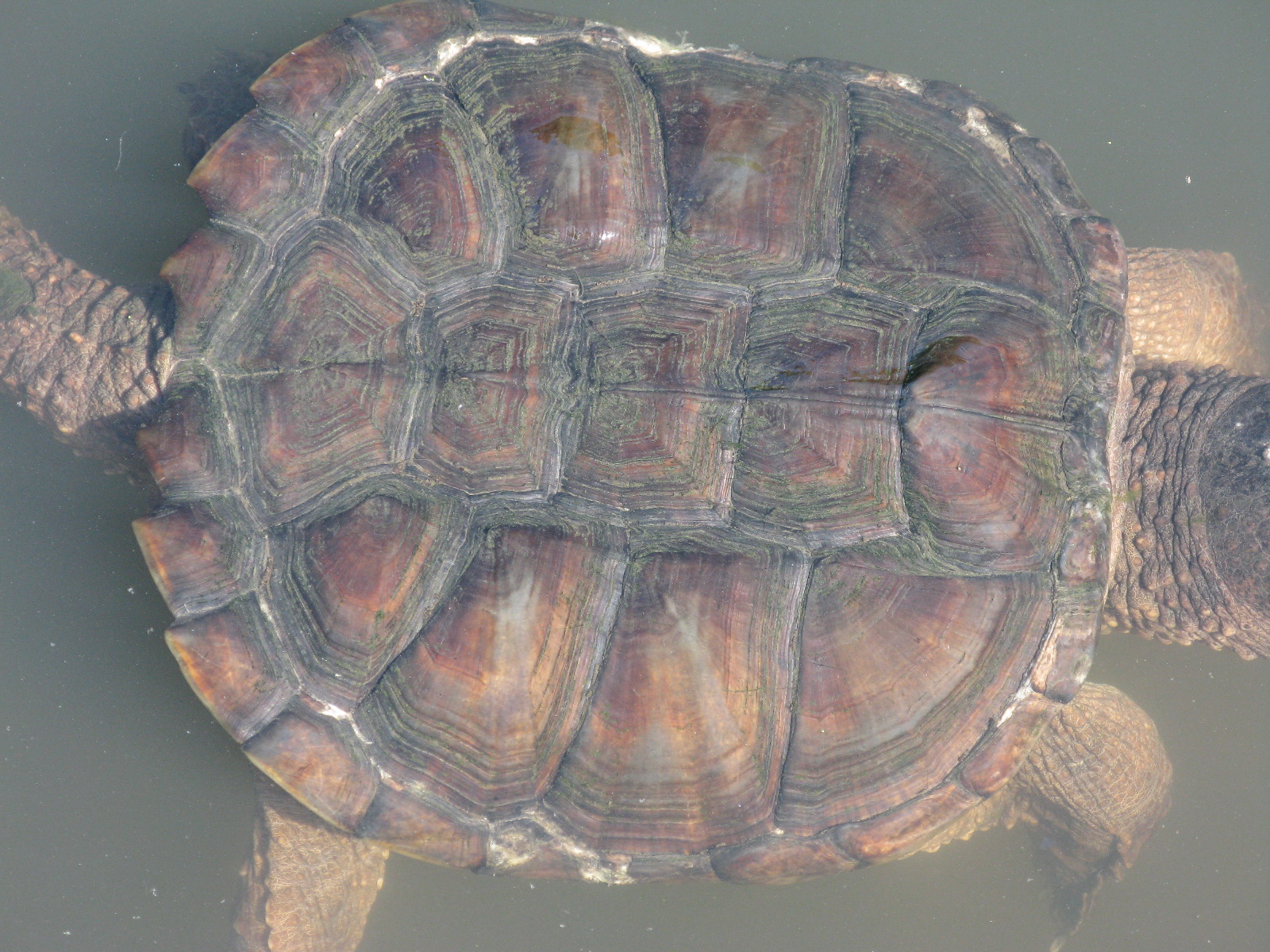 This carapace is beautiful. Another anatomical fact about snappers is that they have very small plastrons (underside shell). These turtles do not bask, so it was nice to catch this one emerging from the murk below.