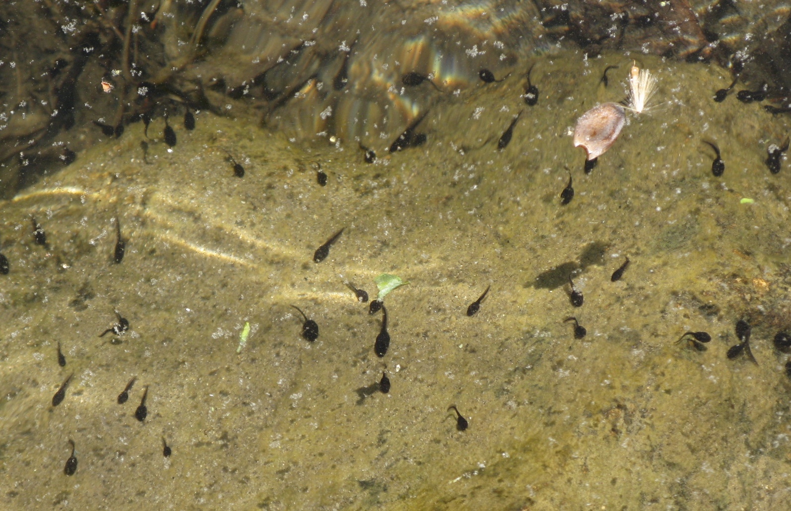 In the reservoir, we saw several eastern newts (Notophthalmus viridescens), impossible to photograph, and oodles, moodles, bidoodles of what turned out to be American toad (Bufo americanus) tadpoles along the shoreline: