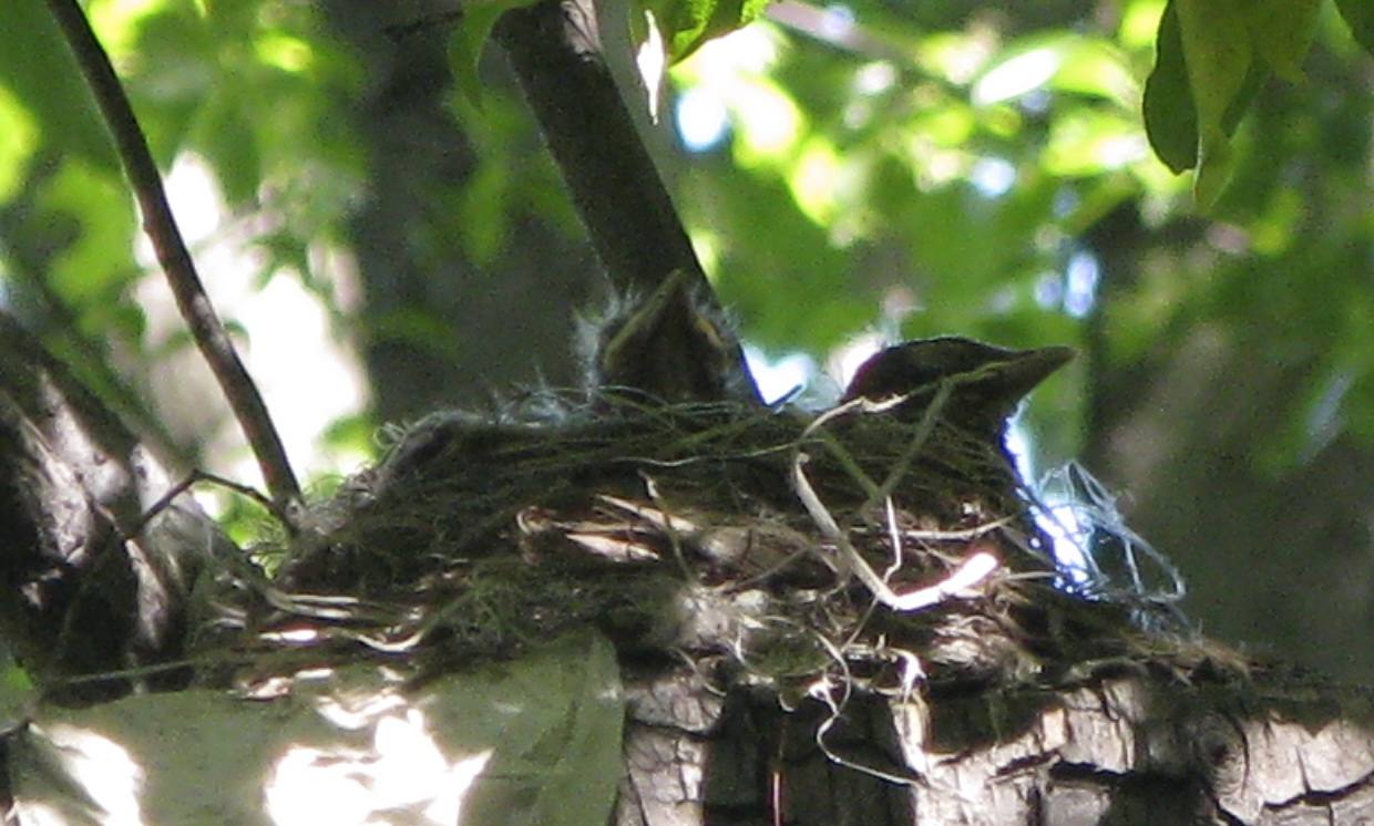 Other robins are still incubating eggs. I walked by a spot the other day that I’ve passed a dozen times in the last month, and only this time noticed that there was a robin’s nest there, at eye-level and well within hand’s reach. One of the birds was there, so I kept my distance. Still other species are only now building their nests: I watched a warbling vireo pair working on their woven cup the other day high in a pin oak. The orioles, recently arrived, should be working on theirs as well. Last year, I watched a female picking at rope tied to a fence for material. Their hanging nests, like all nests, are easier see after the fact, when the leaves have fallen, and look like softballs that have lost their covering.
