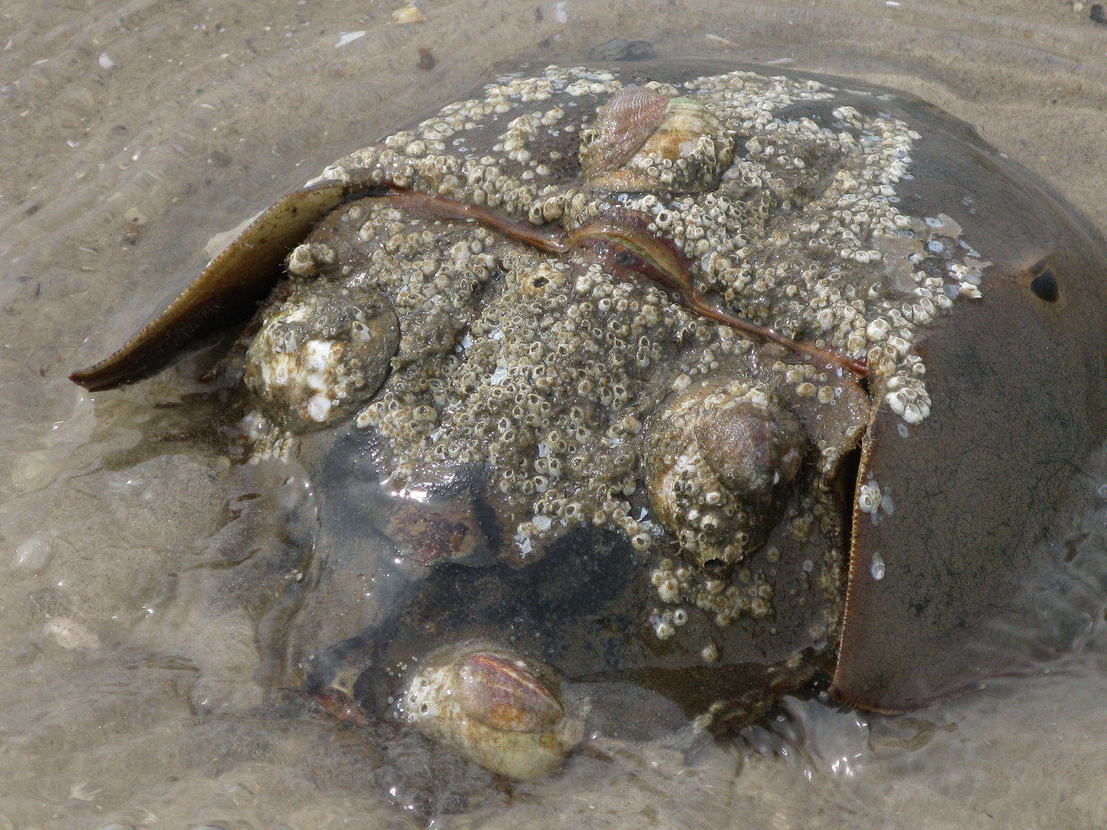 And practice can be hands-on. If you should happen to see a horseshoe crab wrong-side up and obviously still kicking, be a good sport and turn it over. They are absolutely harmless to you, so don’t be afraid of them. Don’t use the telson, or tail, however, which is very delicate and easily damaged (it’s got sensors to tell day from night); just use two hands on the outer edge of the main part of the shell (the helmet-like prosoma) and turn it over.