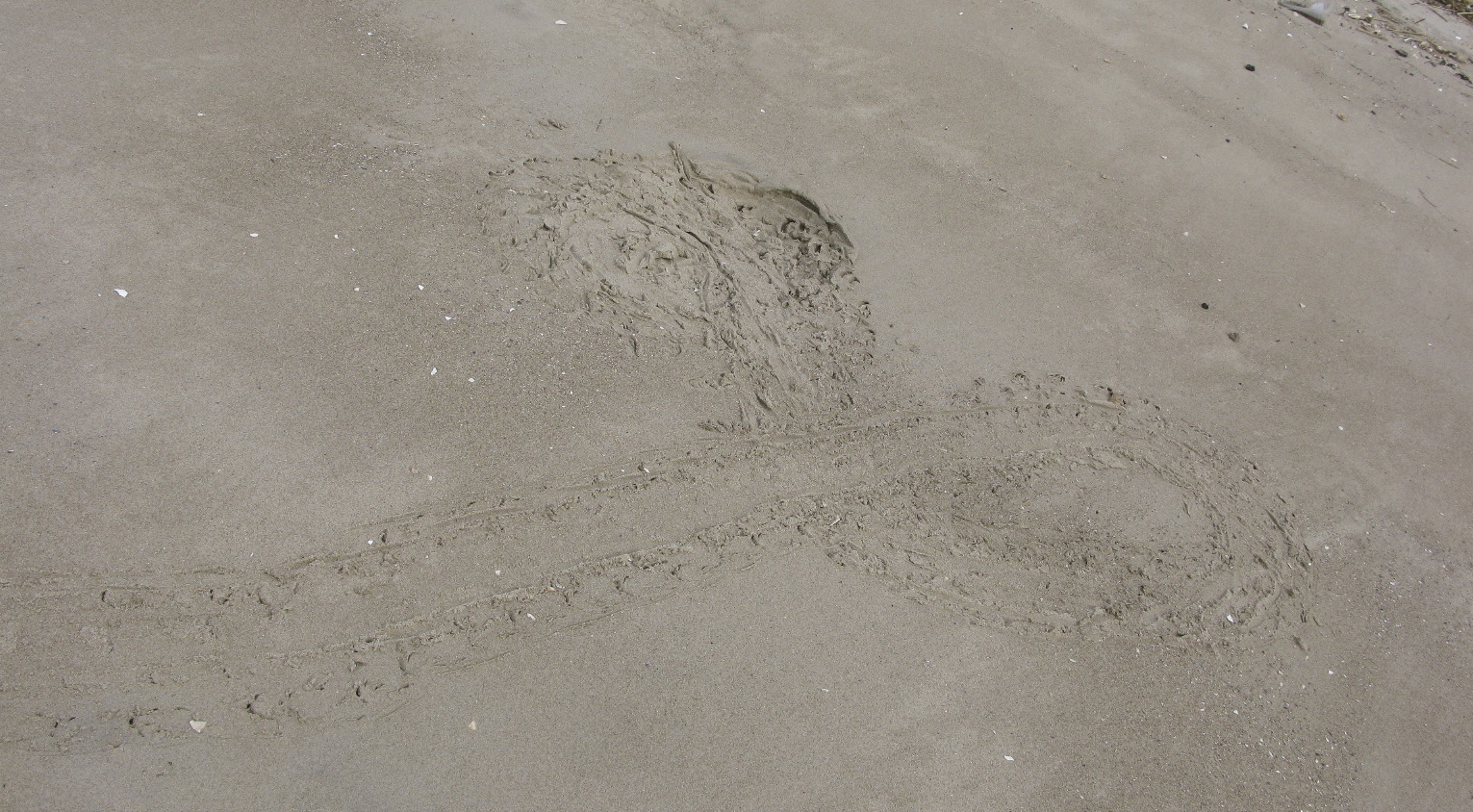 You may want to open this image up for a better view. I think that’s a horseshoe crab nest there in the upper middle of the image. After laying her eggs, the crab then looped the loop on the lower right, and headed back to the sea.