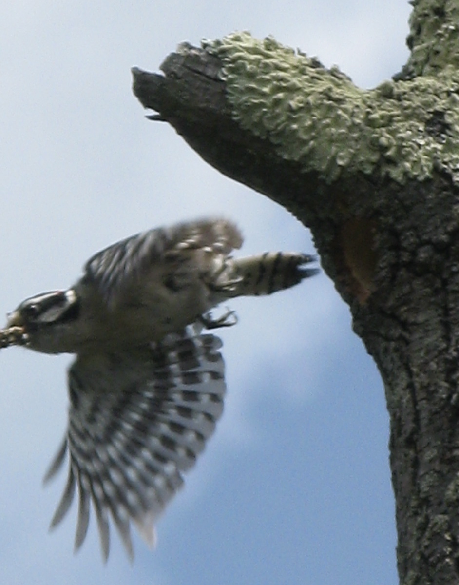 A little later, I heard these high-pitched sounds that I took to be baby birds, but they seemed to be coming from a very thin dead tree. Not until a downy woodpecker, our smallest woodpecker, arrived with beak full of bugs did I see the hole.