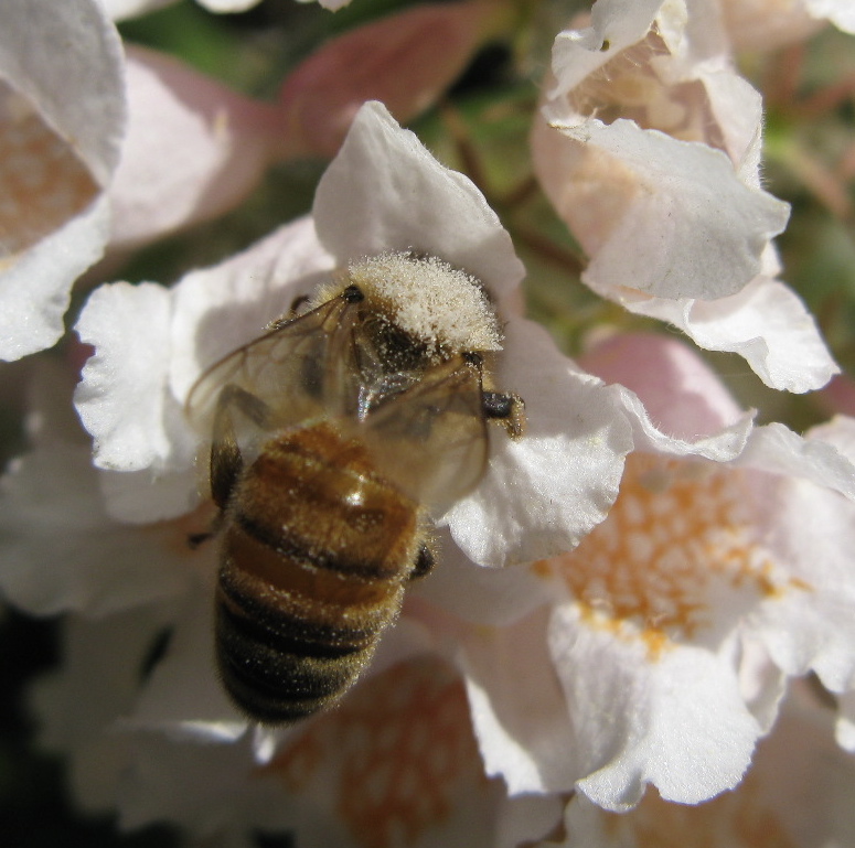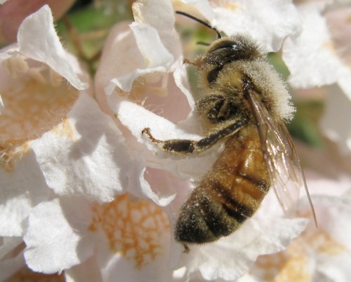 Worker honey bee, Apis mellifera, at forage. All worker bees are female. Note the grey pollen all over the body, especially on the thorax. This big clump of showy flowers was positively vibrating with both honey and bumble bees. Anybody know these flowers?