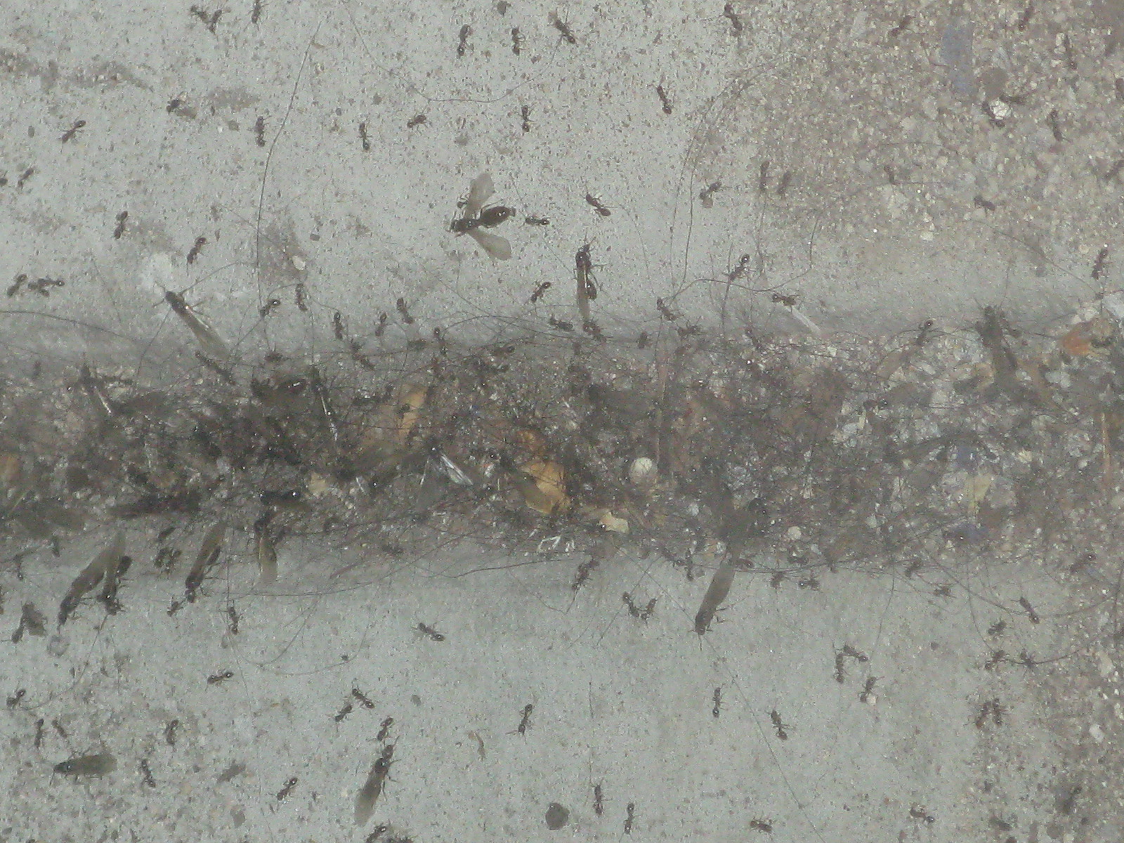 So last night I did get out of bed, determined not to miss this mystery of the night. Holy Formicidae! It was aardvark heaven. “My” ants make their nests in between the concrete slabs. The colony closest to the door was out and about, being seen and making the scene. The drones, the males, were crawling around and whizzing through the air, crazily circling the light while it was on. Look for the big winged jobs above to see some drones. The workers were spread out all over the concrete. Perhaps there was a queen in the mix, too — that ant in the top middle looks really large — but frankly, I didn’t go outside. I wasn’t, ahem, dressed for the occasion, so I shot a couple of pictures through the window.