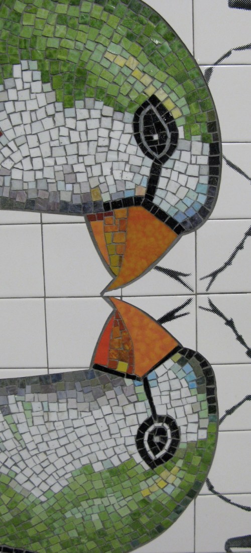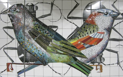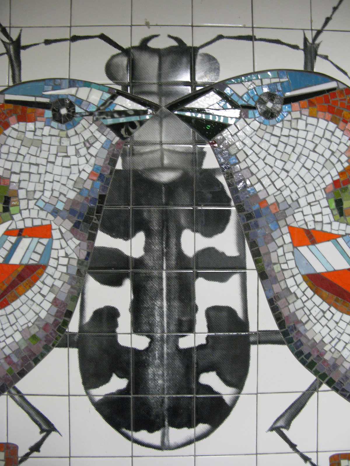 He has pictured the European starling and English House sparrow, both released in NYC in the late 19th century; the South American monk parrot, a more recent arrival; the red lion fish (from the Indian Ocean) and the Japanese koi. These are all invasive species to the region. And there is the native tiger beetle in the background — I’m not sure what species is being referred to, actually — which is on its way out (? NY state has two beetles on its endangered list as far as I could tell, and this isn’t one of them). The beetle looks like a beetle, at least, but I’m afraid the glasswork here doesn’t flow as beautifully as Deborah Brown’s sublime “Platform Diving” at Houston St. (1 train). The house sparrows are unrecognizable; the starlings are better, and the monks are at least parroty. Pity, since we city slickers need all the natural history we can get.