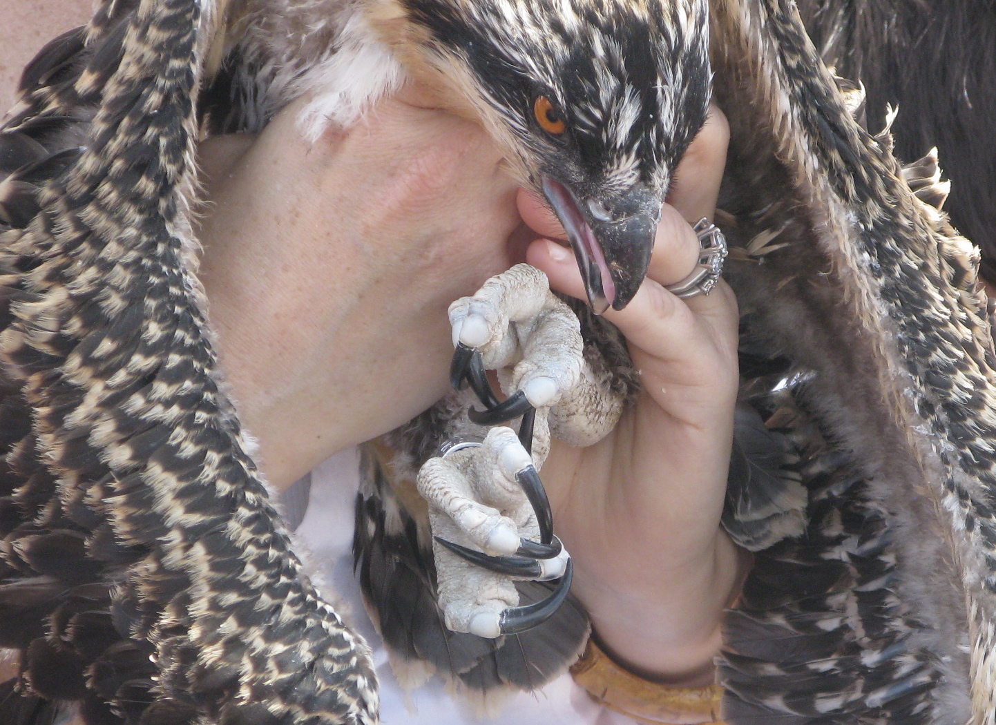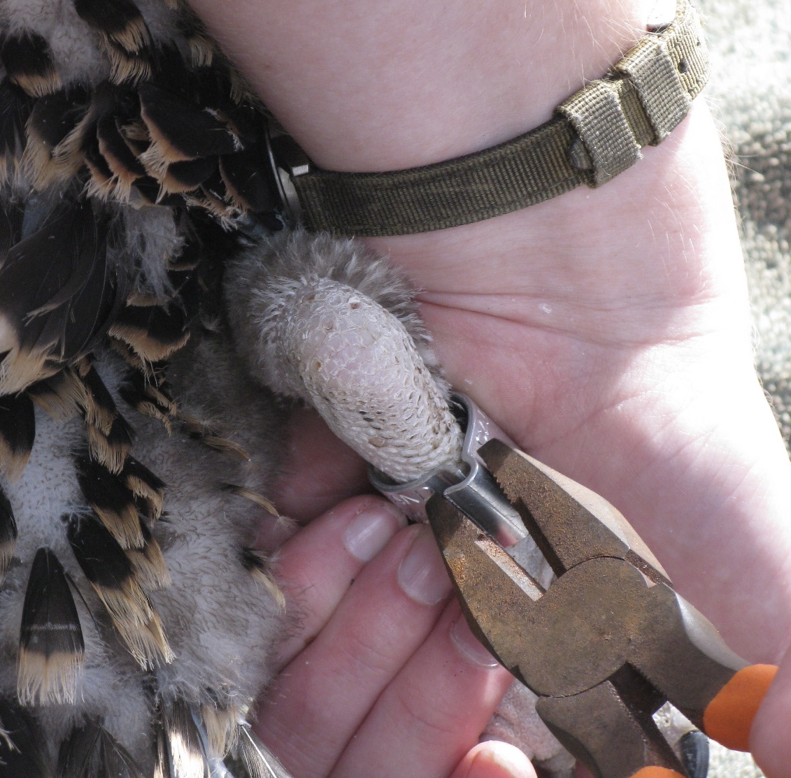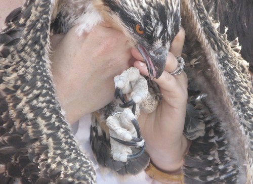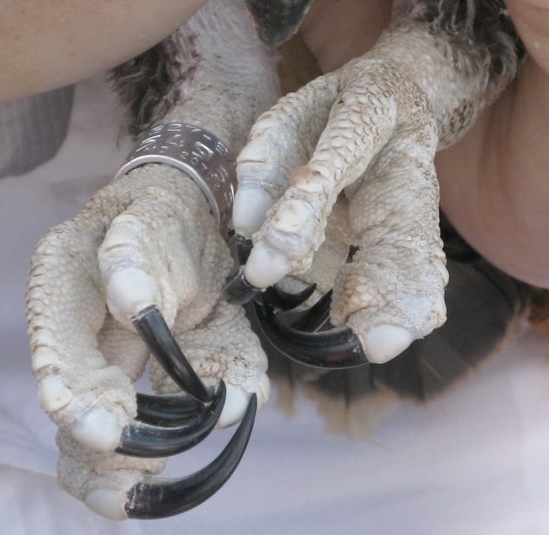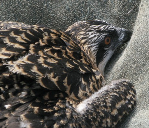 Each nestling was brought down one at a time to be banded and measured. The youngsters played dead on the blanket as their parents flew overhead. The parents were pissed, as you might be.