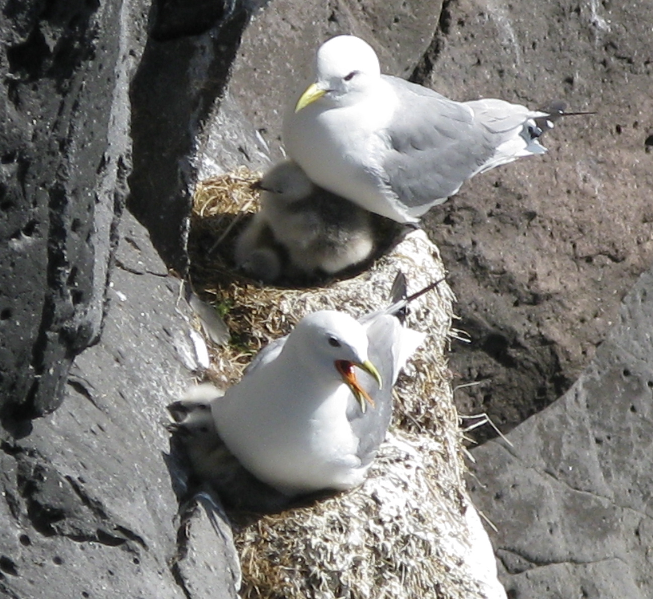 Black-legged kittiwake (Rissa tridactyla), at Arnarstapi. Two chicks are usual.