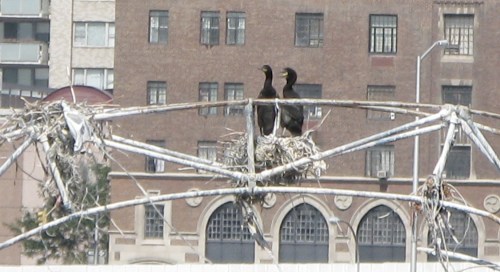 Today: a couple of double-crested cormorant youngsters still on a nest on U Thant Island in the East River. Which, of course, isn’t a “river” at all. At best it’s a tidal strait. The Burmese U Thant, meanwhile, was the third Secretary-General of the UN (serving 1961-71); the island is a canon shot across the water from the UN Secretariat building. It’s just a short length of rocks — originally called Man o’ War Reef — that has been added to over time. Most notably by old man Steinway’s plans for a trolley tunnel to his piano factory in Queens. ! Pretty amazing city when you think about it. Come on over and visit sometime.