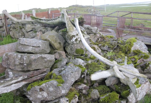 Jawbone, vertebrae, and rib of a large toothed whale, probably a sperm whale.