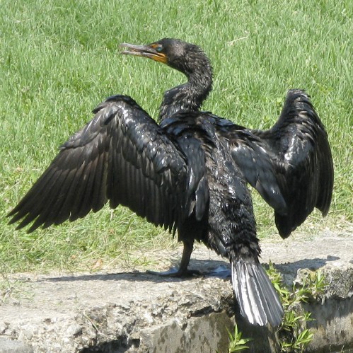 Double-crested cormorant (the crest is a mating plumage fillip) drying out. Unlike ducks, cormorants don’t have oiled feathers, so the water does not run off their backs. They use the weight of the water in their feathers to help them dive deeper after their fish prey, but need to get back to equilibrium so will often be seen posed this way.