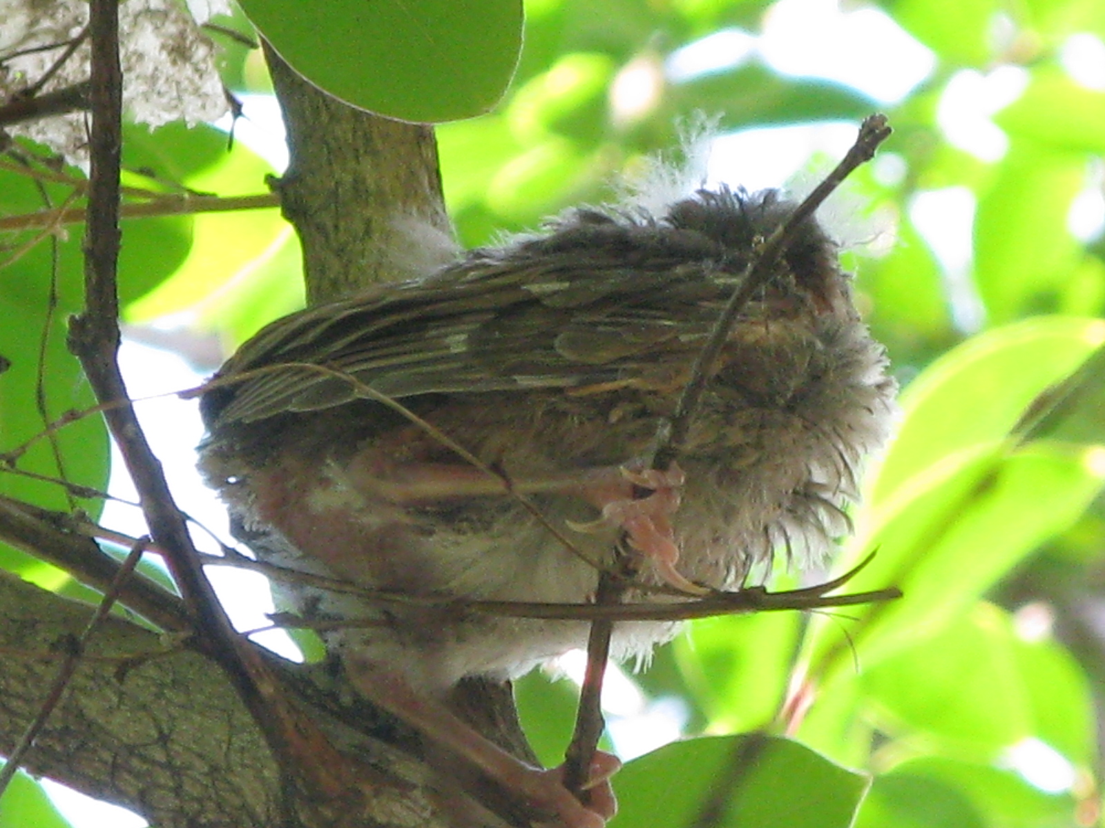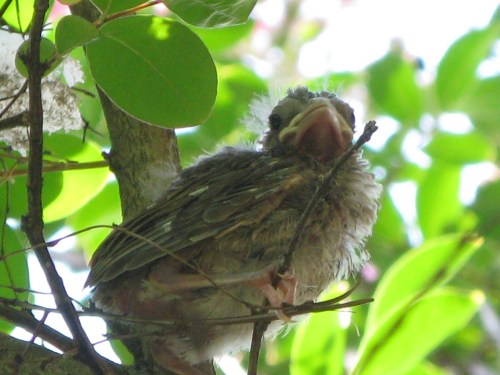 This is late in the season for a nestling, so this was perhaps a second brood, or even a second nesting attempt, for the year. (There seemed to be at least one more nestling in the nest itself; there was also another nest, looking inactive, in this rather small tree.)
