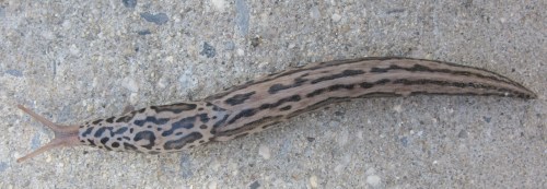 Leopard slug, Limax maximus. Invasive, imported from Europe. Approximately 4” long.