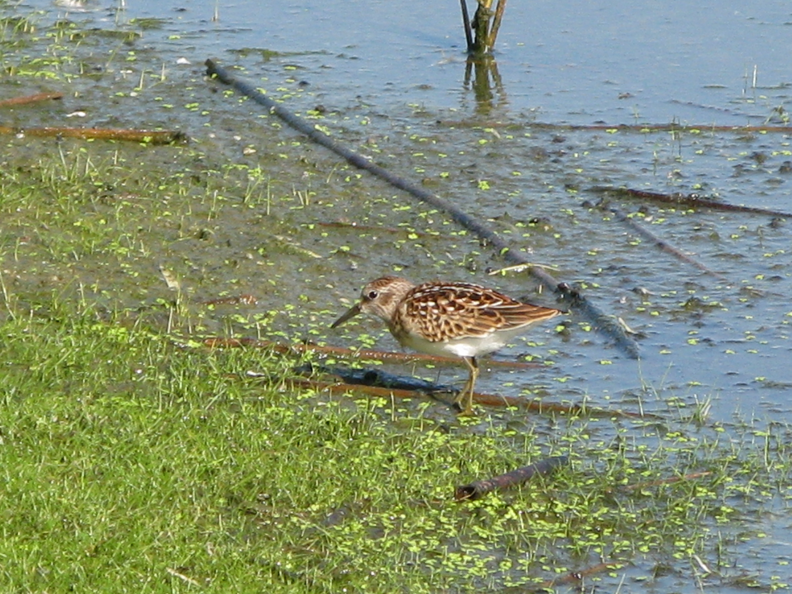 Least sandpiper, Calidris minutilla. Stalking the duck weedy edge of the East Pond.