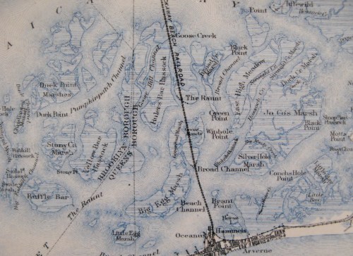 The Raunt was named for a channel, since filled in. In fact, there were/are several “Raunt” channels in the area. The topography of the area north of Broad Channel has changed radically in a century. A little archipelago has been cobbled together into one piece of land by dredging and filling. Some of the bits of land that were consolidated were Goose Creek, Rulers Bar Hassock, Black Bank Marsh, and Jack’s Hole. Life’s man says “Raunt” is from the Dutch. I couldn’t find any sign of it in the English. This piece in the Rockaway Wave offers some folk etymology, but I’m not convinced. Got any ideas? This NPS pdf of a history of Jamaica Bay has some basic maps of the changes in the area, starting on p.76.
