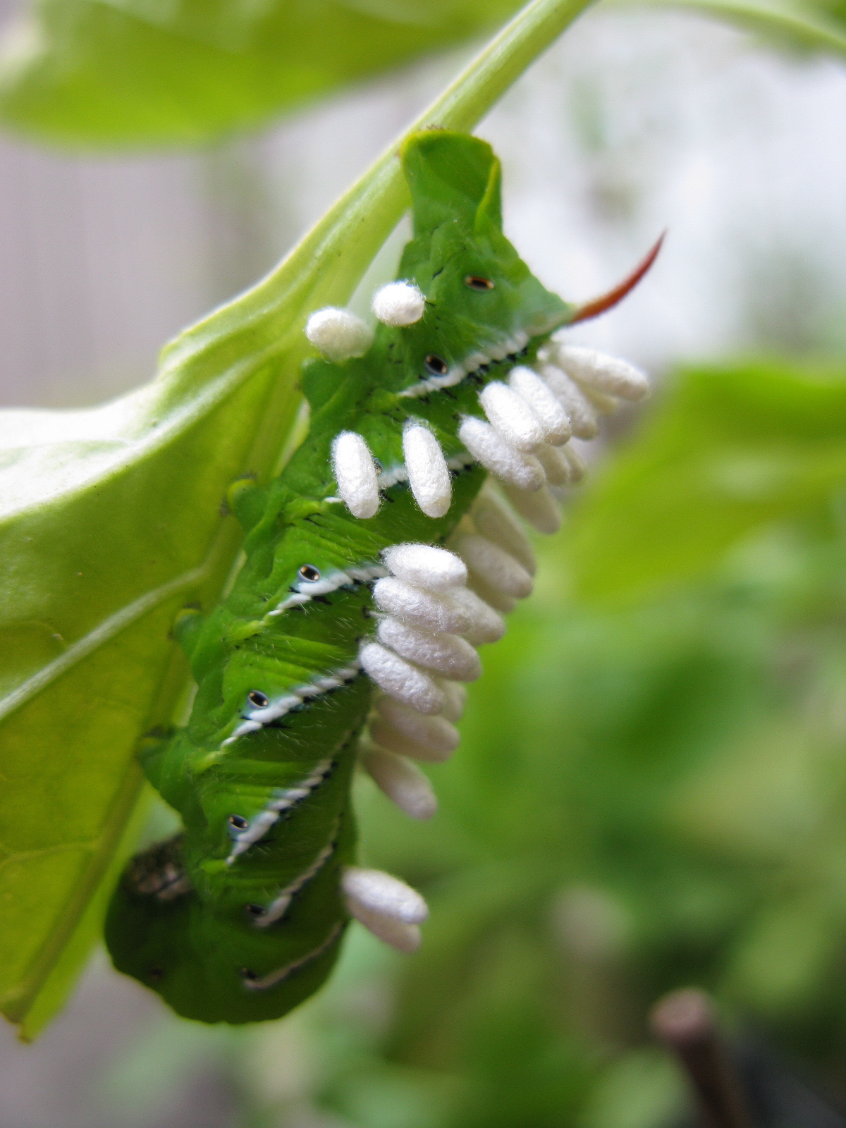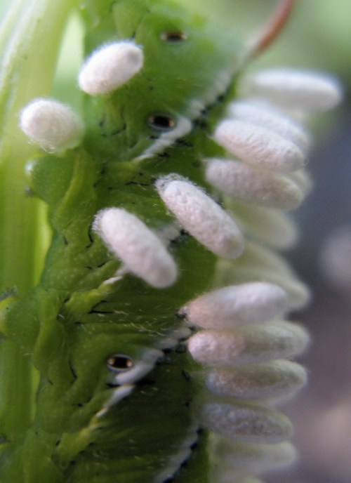 I first noticed these hornworms a couple of weeks ago, before my Internet and phone service vanished (fuck you, Verizon). A bit later, the first caterpillar, on the pepper plant, turned out to have been taken over by its natural enemy. A parasitic braconid wasp, Cotesia congregata, uses the live body of the caterpillar as a host for her eggs. Dozens of eggs, which are injected into the caterpillar. The eggs hatch, the larva grow, and then tunnel out of the caterpillar to spin these tiny cocoons. The caterpillar dies a slow and presumably agonizing death, as it is eaten from the inside out.
