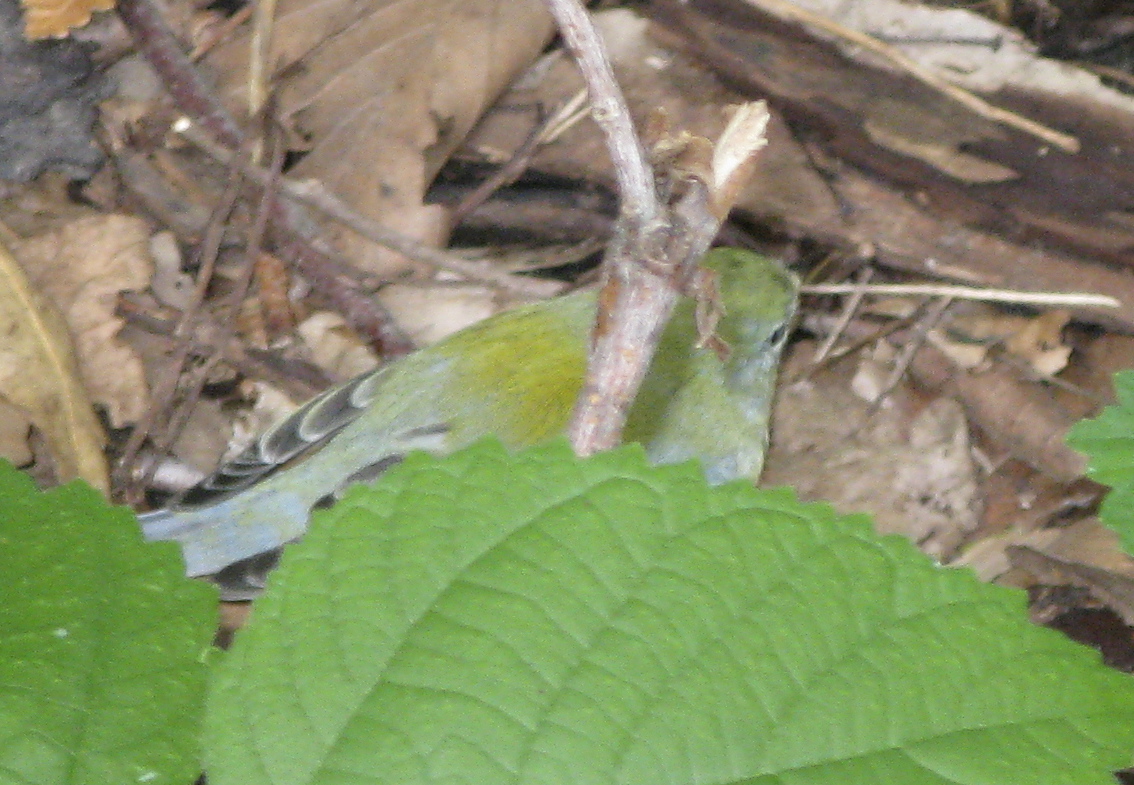 Northern parula, Parula americana, a species typically found at the top of trees. But this south-bound migrant was hungry, and was flitting around at eye-level in Prospect Park before it descended to wrangle with a caterpillar on the ground. An unleashed dog chased it away. The green mantle on the back is an excellent field mark.