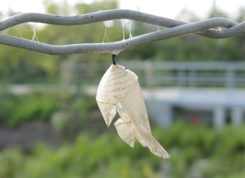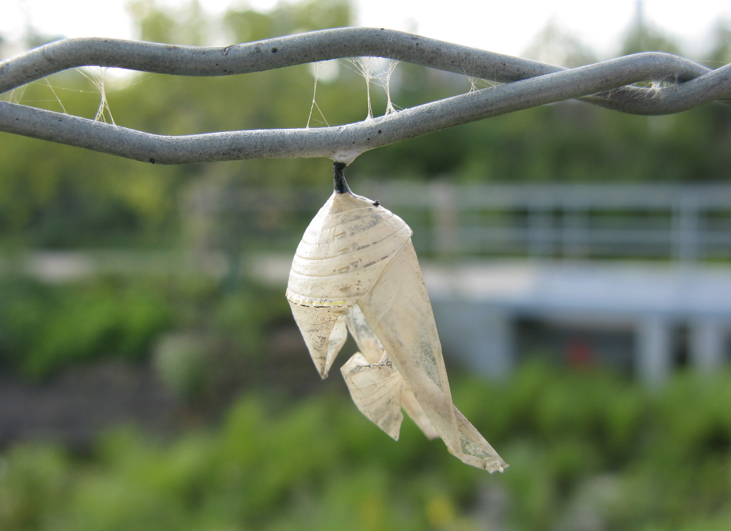 The remains of a pupa, or chrysalis. This was, I think, the temporary home of a specimen of a Monarch, Danaus plexippus, as it underwent metamorphosis from caterpillar to butterfly. The caterpillars themselves were much in evidence here in Brooklyn Bridge Park at the end of August, gobbling up milkweed.