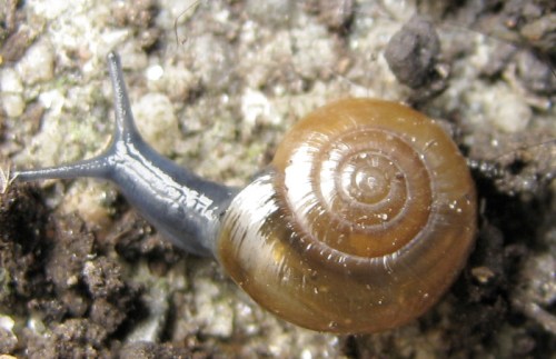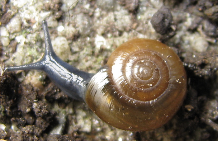 I find this land snail strangely beautiful: the contrast of amber shell and blue grey gastropod itself. The shell is about 1/4th-inch across, so bigger than the disks, and much smoother. The umbilicus, which is on the other side of the shell, is very deep (like Jimmy Joyce’s Omphalos). I think it’s a member of the family of glass snails, Oxychilidae. It looks like it might be Oxychilus draparnaldi, but they are supposed to be rather larger, so I’m not sure.