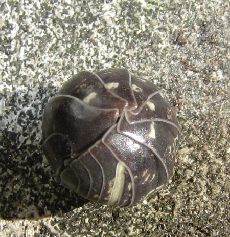 A closer look at the Common pillbug, Armadillidium vulgare, also known as common woodlouse or roly-poly. When disturbed or otherwise bummed out, these roll up into a tight armored ball. Love the overlapping plates here. These are not insects, btw; they’re crustaceans.
