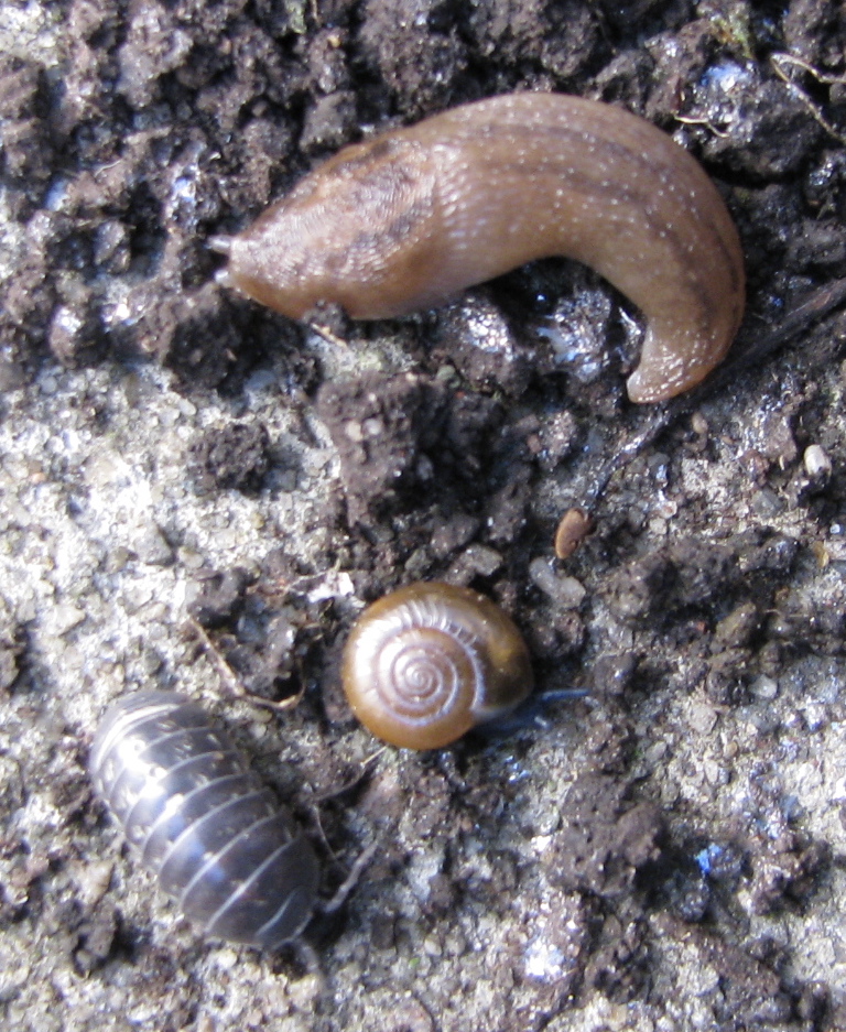 More tidying up in the Back 40 in preparation for winter. My backyard is a Brutalist expanse of poured concrete, so I use numerous pots for planters. All were salvaged from the street. There’s also a found-on-the-sidewalk wooden box, festively decorated with painted balloons. While moving this the other day, I found these creatures beneath it. Generally shunned by the dainty among us, these creatures of the shady damp — slug, snail, pillbug — are key to decomposition and recycling nutrients, and thus making the world go ’round and ’round. An earthworm, three more of the disk snails pictured in a previous post, a centipede, some smaller pillbugs, and several way-too-small-to-figure-out things were under there as well.