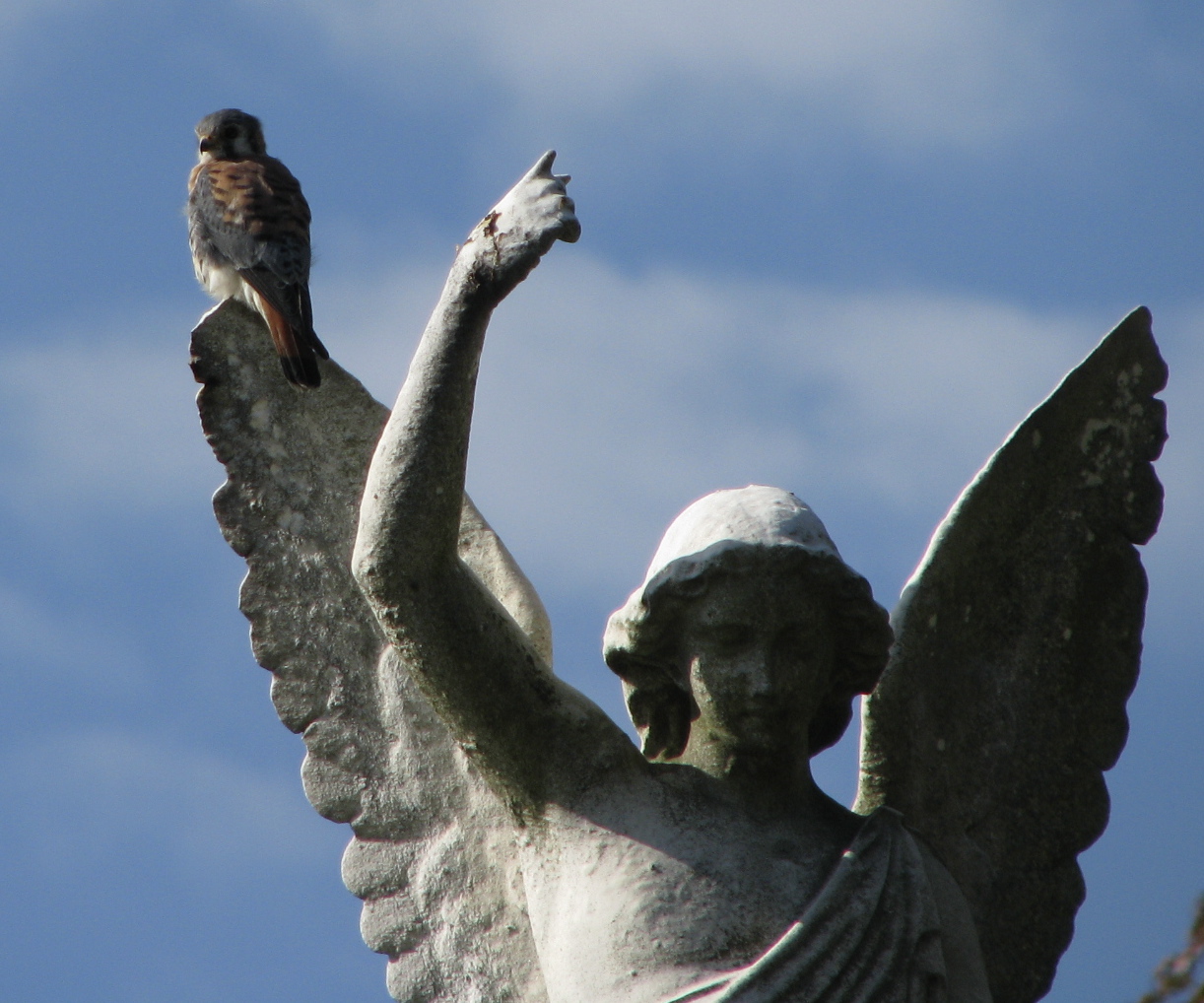 Actually, the cemetery’s been a raptor paradise this fall: I’ve seen red-tail hawk, sharp-shinned hawk, Cooper’s hawk, kestrel, merlin, peregrine, and osprey. That wind in the air isn’t a ghost.