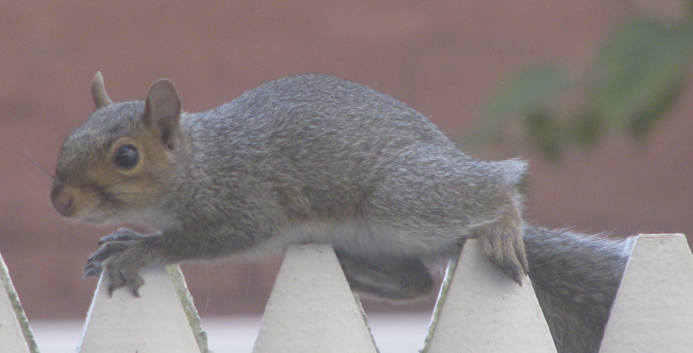 That hearty urban mammal, the gray squirrel, Sciurus carolinensis, makes its way across the Back 40 Bypass between the abandoned house to the south and the half-abandoned house to the north. (It’s a bit of a slum corner, I’m afraid.) The squirrels have a condo in the upper stories of the half-abandoned house to the north and a summer place in the gut job to the south. They make occasional detours into the Back 40 to bury peanut shells in my pots, which host some of the only available earth around. I place the business ends of wooden skewers like a palisade around the pots to discourage this practice, which otherwise results in good rich dirt being scattered all over the place, and, I have to say, a couple generations of forgotten peanut shells.