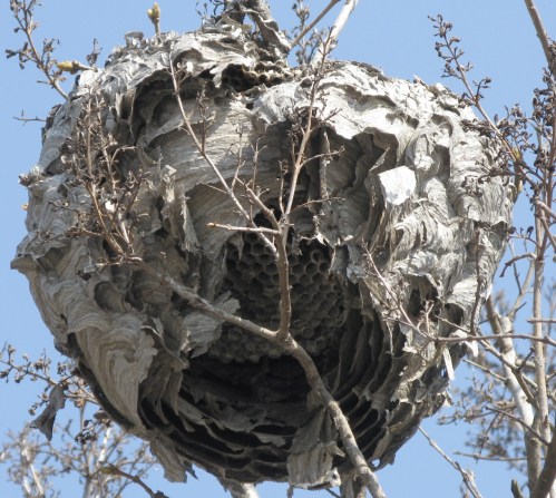 For instance. The paper wasp species, including the bald-faced, build their comb facing down. So why don’t the larva just fall out, going to gravity’s destiny? Well, the combs are made of paper, which is mostly cellulose, and hence very electrostatic; wet things like larva and food just stick to it. Water loves paper. The social bees (honey and the stingless bee species), meanwhile, who make their comb out of wax, align their comb horizontally. Water and wax do not love each other: the larva would slip out if the comb were aligned downwards.