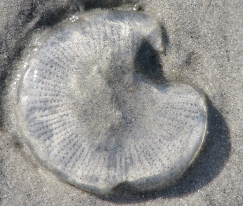 Moon jellyfish, Aurelia aurita. They have a mild sting in the water, but are supposedly safe when dead on the beach — although I’ve never tried to confirm that. This is a common species in our area, and are found on both bay and ocean beaches. (Recently, on another beach, in much colder weather, we found a bunch of them frozen — this is probably a delicacy somewhere, calling Iron Chefs!).