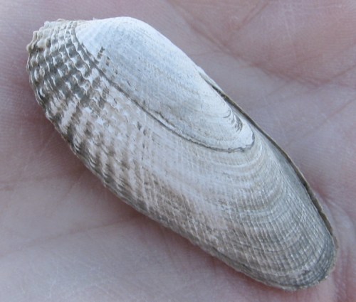 This is a false angel wing clam, Petricolaria pholadiformis. This species is found up and down the East Coast, but the shells are rather fragile and rarely survive the tumble of the wash-ashore. In fact, this was the first time I’ve ever seen one whole. It was far from the water, and probably dead, but we put it back into the water, anyway, just in case. Later we found some of the empty shells; they might be thought of as fallen angel wings, at least by the Miltonians amongst us.