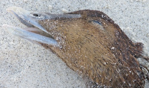 A female Common eider, Somateria mollissima, dead on the beach, one of several in a mile or two of walking. These eiders are found close off-shore of Nantucket Island through the winter. The males of this large sea duck species are boldly patterned in black and white.