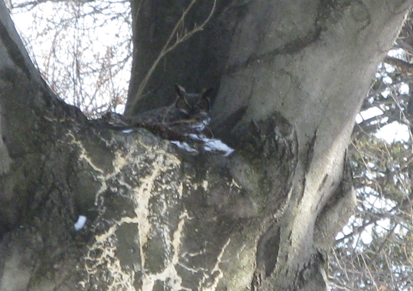Great Horned owls generally nest very early in the year, which means they have more of the elements to worry about. As you can imagine, the very cold and the very wet (rain is worse than snow) are great hazards to vulnerable eggs and hatchlings. The owls seem to do this so that their young are born, and hungry, when other bird species are nesting, and hence particularly vulnerable to predation.