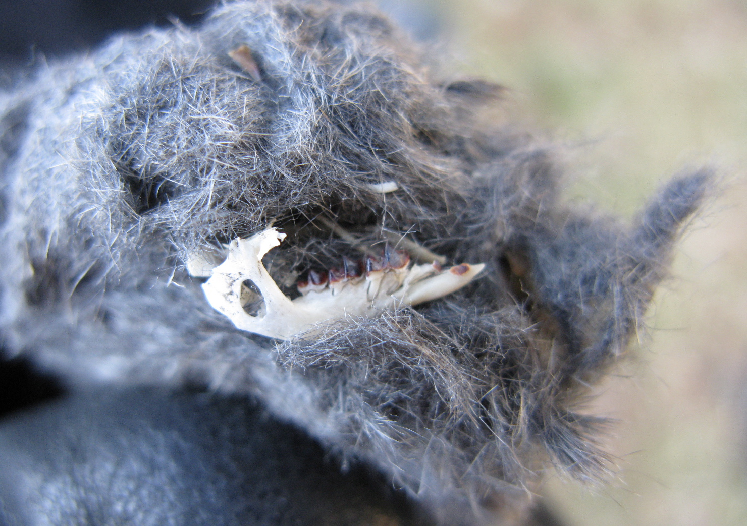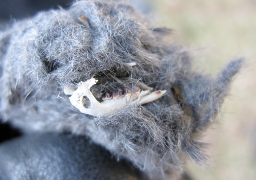 Owls gulp their prey whole and then later throw up pellets of undigested fur, feathers, and bones. Many people may remember these pellets from biology classes, where they are dissected to analyze the contents. The wetter, fresher, ones look rather turd-like; the older, dryer ones are softer and furrier. The one pictured, formerly a mole or shrew or mouse, was found in the New York Botanical Garden. (Here are some I found last Thanksgiving outside the city.)