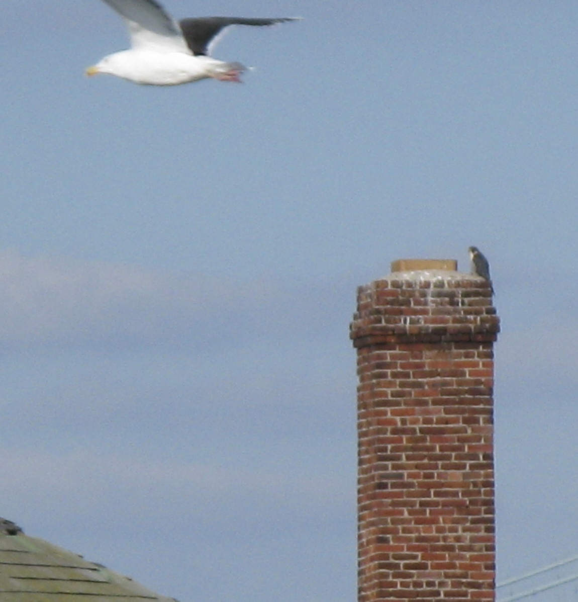 The harbor seals themselves were hanging around Swinburne Island. The NY Aquarium rep on board counted ten for the seal census they are conducting, but not a one of the slippery mammals was hauled out on the rocks, where they often like to loll about like beached blubber torpedoes. Swinburne is one of two small man-made islands south of the Verrazano Bridge off Staten Island. It is tiny (2.5 acres) and crowded with a trio of brick ruins, real fixer-uppers. It’s named after the man who oversaw the island’s construction and was once home to a small isolation hospital and crematorium. I don’t know if the existing chimney there was part of the crematorium, but it’s now a peregrine perch; one landed on it as we rounded the island, and was still there when we returned past later in the cruise. A couple members of the crew said that they frequently saw the raptor there.
