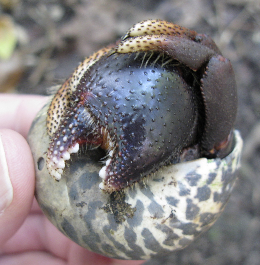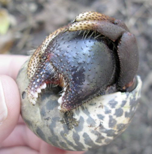 Most of the ones we saw used West Indian Top Snail shells for their home. It was odd seeing these turban-like seashells, which have a nacreous interior, way up the forested hill.