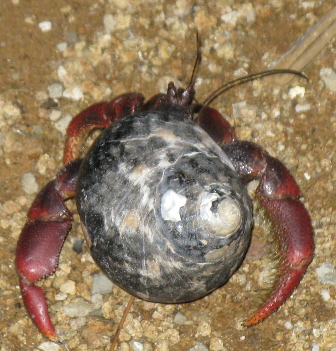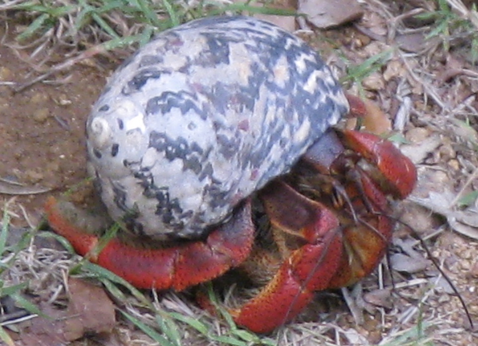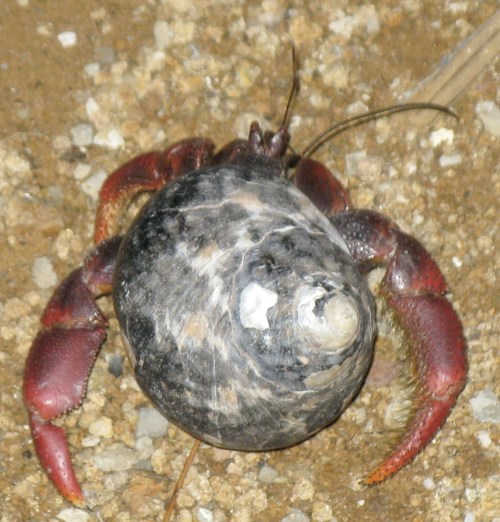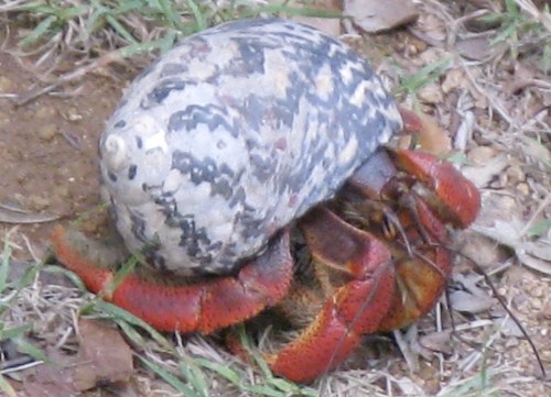 This is Coenobita clypeatus, the Caribbean hermit crab, a common sight on the island and elsewhere in the region. They are also, evidently, legally sold in the pernicious pet trade.
