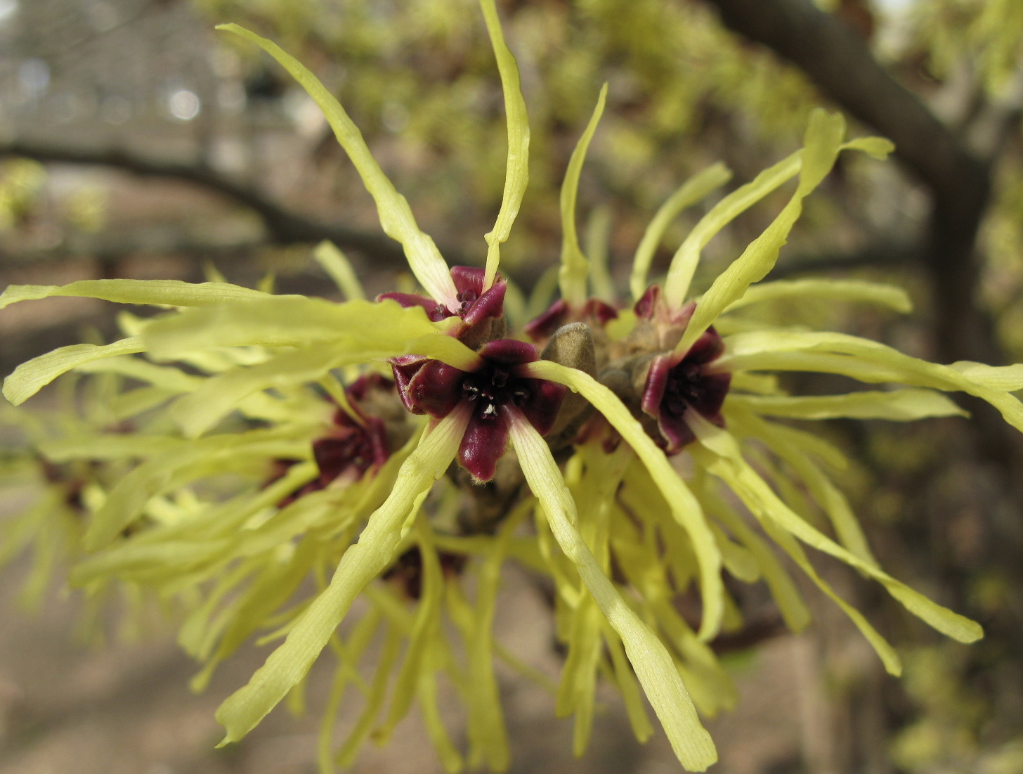 And in Prospect Park, several tree species are flowering. Most of these early springers make modest little flowers, emerging before leaves, which give the trees a fuzzy appearance. This Chinese, or hybrid, witch hazel, meanwhile, makes a showy, odd-ball flower. (The American witch hazels, H.virginiana are unique because they bloom in autumn.)