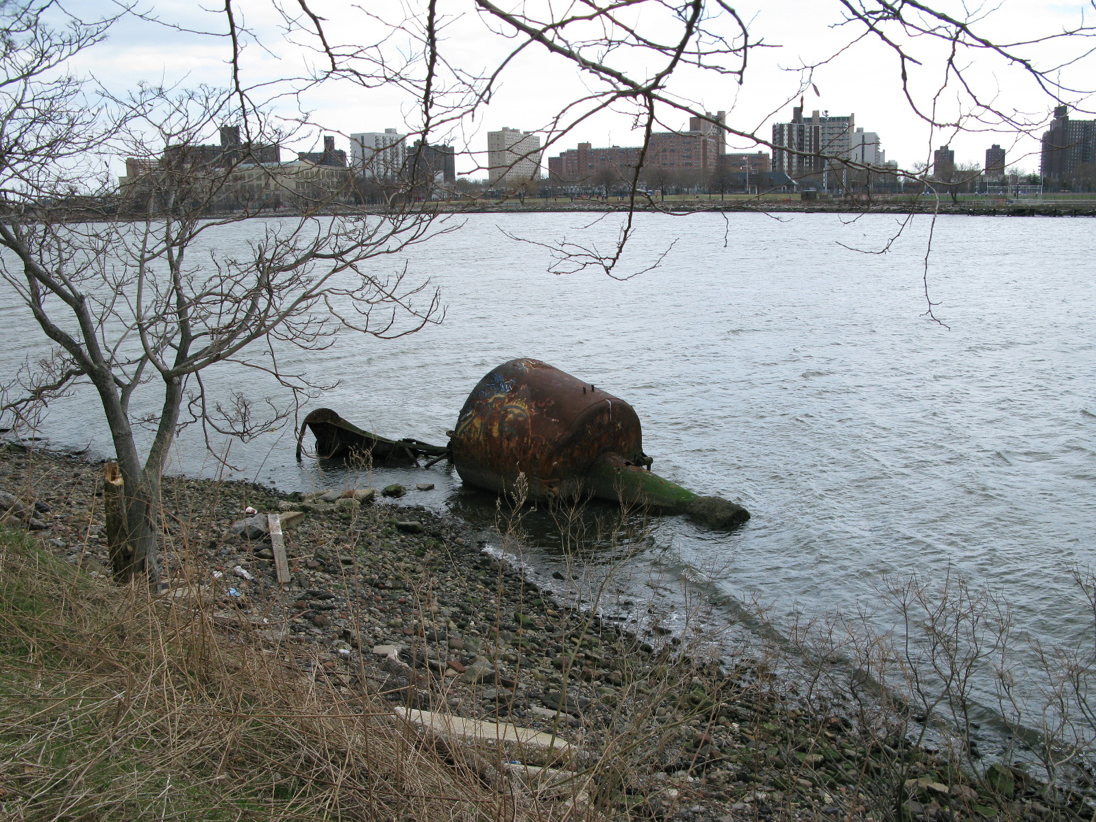 Calvert Vaux was born in London (the family name rhymes with “fox”), immigrated to America, worked with Andrew Jackson Dowling, the founding father of American landscape architecture, and published Villas and Cottages, a landmark of American neo-Gothic design. Vaux’s great claim to fame, however, is teaming up with Frederick Law Olmsted to work on both Central and Prospect Parks. The two men had a famously testy relationship, but the glory of their parks is testament to their clash of prickly genius. Olmsted, who wrote a lot and had a son/step-son carry his name well into the 20th century, long overshadowed Vaux (there was a benighted time when Olmsted got sole credit for the parks). Both men had sad ends, Olmsted sinking into senility, Vaux drowning in Gravesend Bay in 1895. It seems that one day he took a walk and never came back. It was rather mysterious. His body washed ashore along the south coast of the borough. Some belated recognition has come in the renaming of Dreier-Offerman Park in Bensonhurst for him. (The park had been named for a home for unwed mothers; some of the land cobbled together for the park had been used for landfill from construction of the Verrazano Narrows Bridge.) Half-sunk barges and the famous yellow submarine clog the inlet between the southern and northern parts of the park. The inlet in particular becomes muddy flat at low tide, making it rich bird habitat (I saw a guy crabbing there once, too); and the park as a whole is an important first stop for migrating birds coming up from the south.