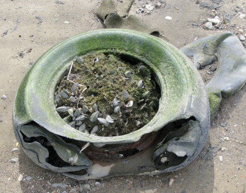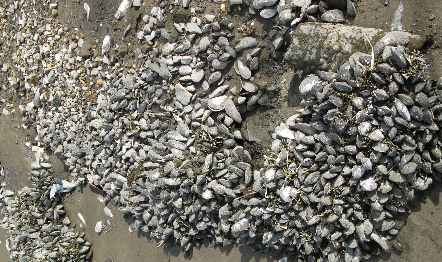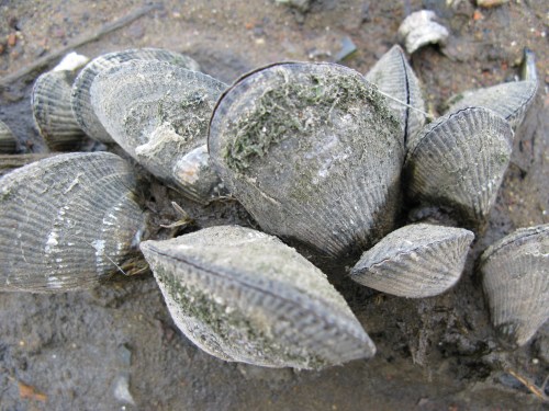 The Atlantic ribbed mussel, Geukensia demissa, at low tide at Calvert Vaux Park. Unlike the more famous (because delicious) blue mussel, Mytilus edulis, the ribbed mussel, which is found up and down the East Coast, prefers brackish waters.