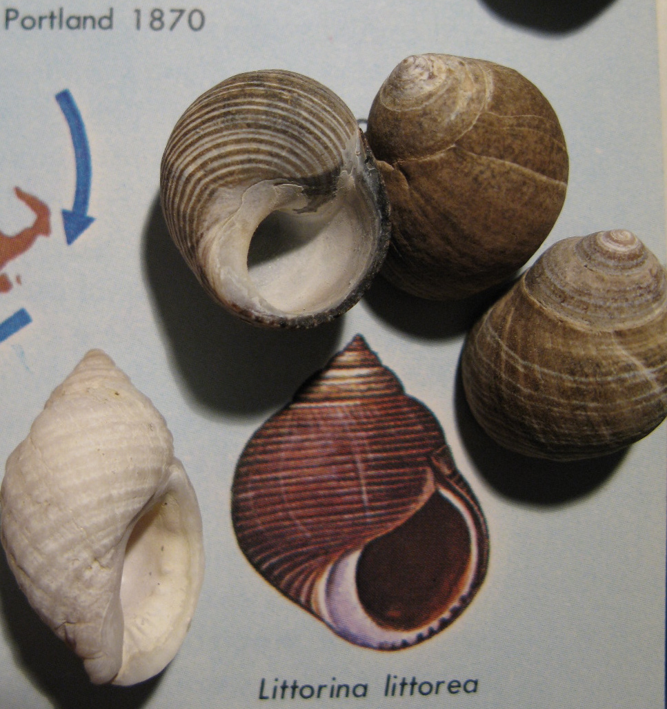 Four shells collected at Cape Anne, Massachusetts. The three clustered around the illustration are Common European Periwinkles, Littorina littorea. This winkle, much savored by Old World palates, was first recorded in the Gulf of St. Lawrence in 1840, perhaps arriving via rock ballast in ships. Another source says they may have arrived much earlier, upon drifting logs before the Europeans themselves arived on more ornate drifting logs. However they got here, they’re now established on both U.S. coasts and they tend to be bad news for the ecosystem. We should probably be eating them, too.