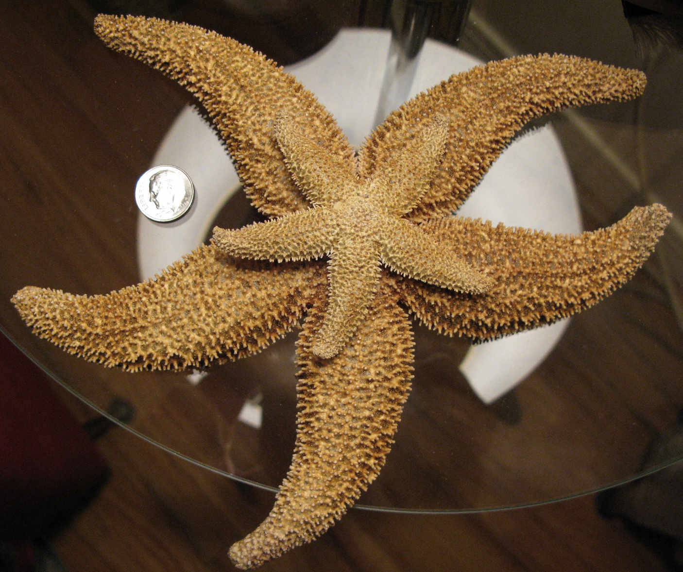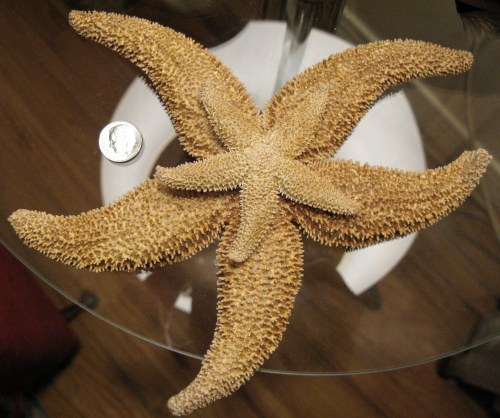 The common sea star, Asterias forbesi, is no stranger to our waters, but, as noted, you usually don’t see them on the beach. Most of the ones in this pile were small, but there were a couple of big-handed ones. (The size difference is illustrated above.) These echinoderms (from the Greek for “spiny skin”) wrestle bivalves apart with their arms and force their stomachs in between the shells to eat the goodness inside. (Further comment, it seems to me, would be superfluous.)