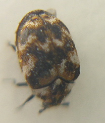 I don’t have any carpets, but this cosmopolitan creature’s larvae feeds on most anything found indoors, including cereal, leather, silk, sweaty synthetics, and other dead bugs. (Menu source: NWF’s Field Guide to Insects & Spiders of North America by Arthur V. Evans.) It’s one of the Dermestidae, or skin beetle family. If your’s is crawling, get over it. The adults are usually found outside feeding on pollen, so this one must have have made a wrong turn or else was planning on egging my place.