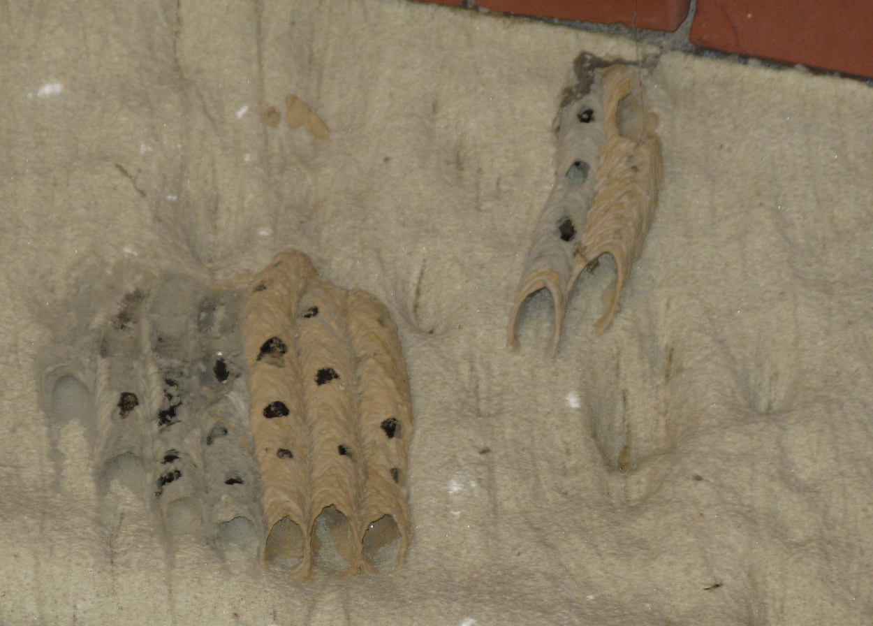 Compare these wonderfully architectural nests with the much more free-form mudpile of the black and yellow mud dauber wasp, which is currently nesting in my backyard, the Back 40. Also consider the completely other material differences with the paper nest of the bald faced hornet.
